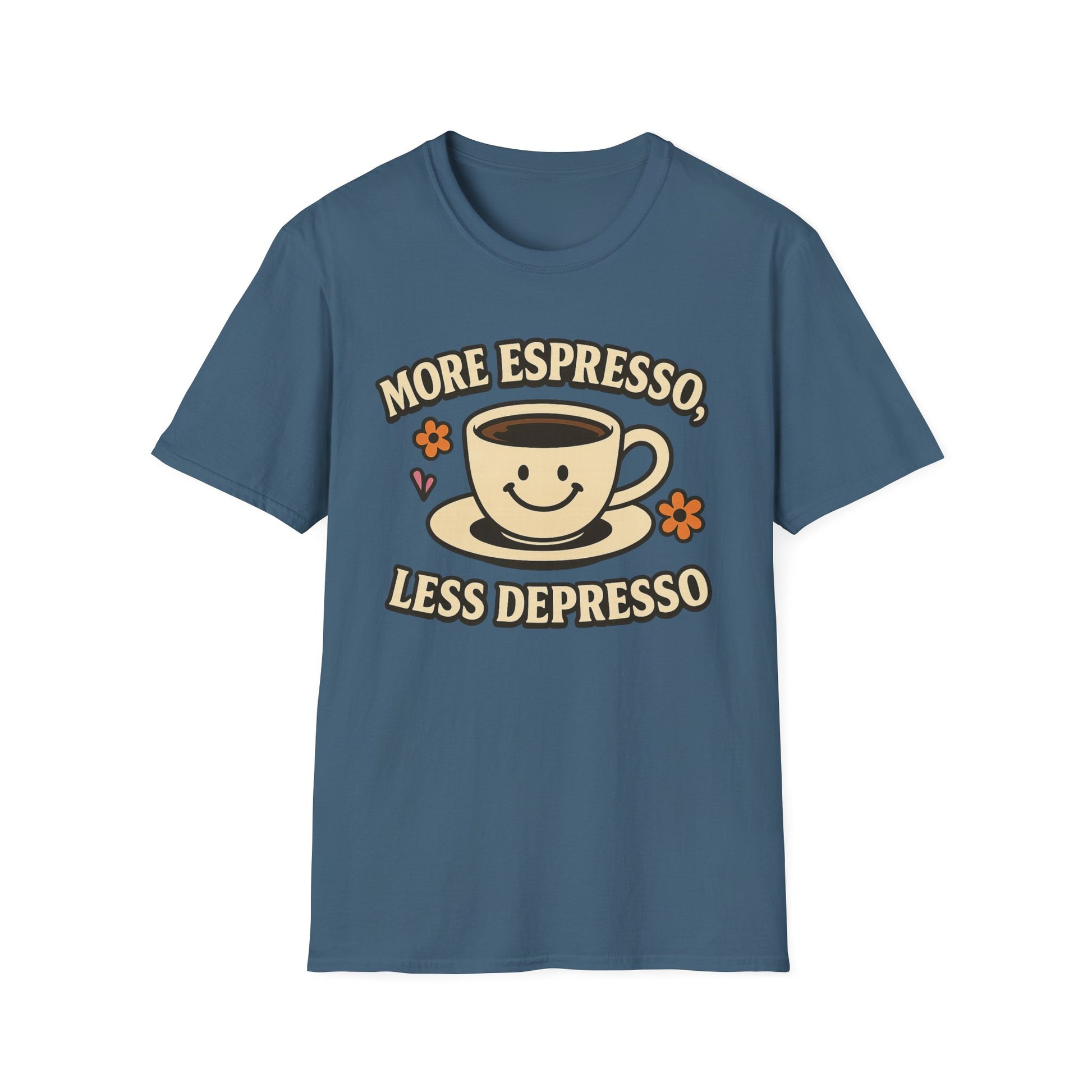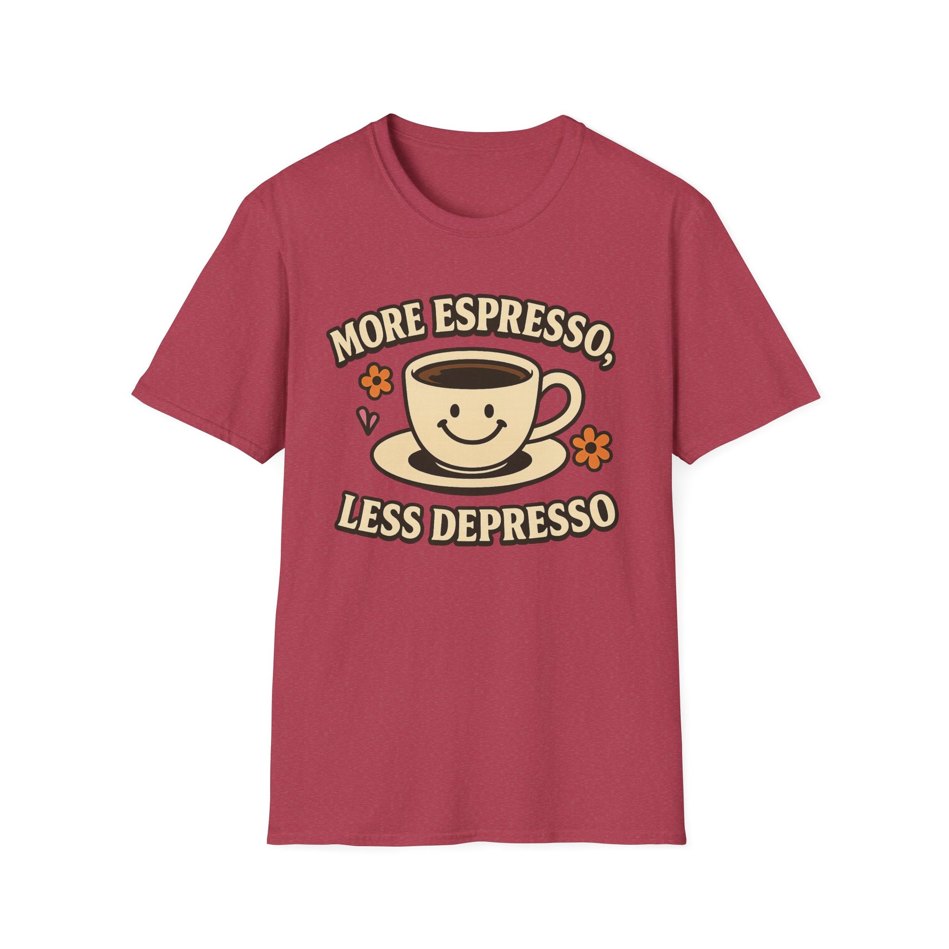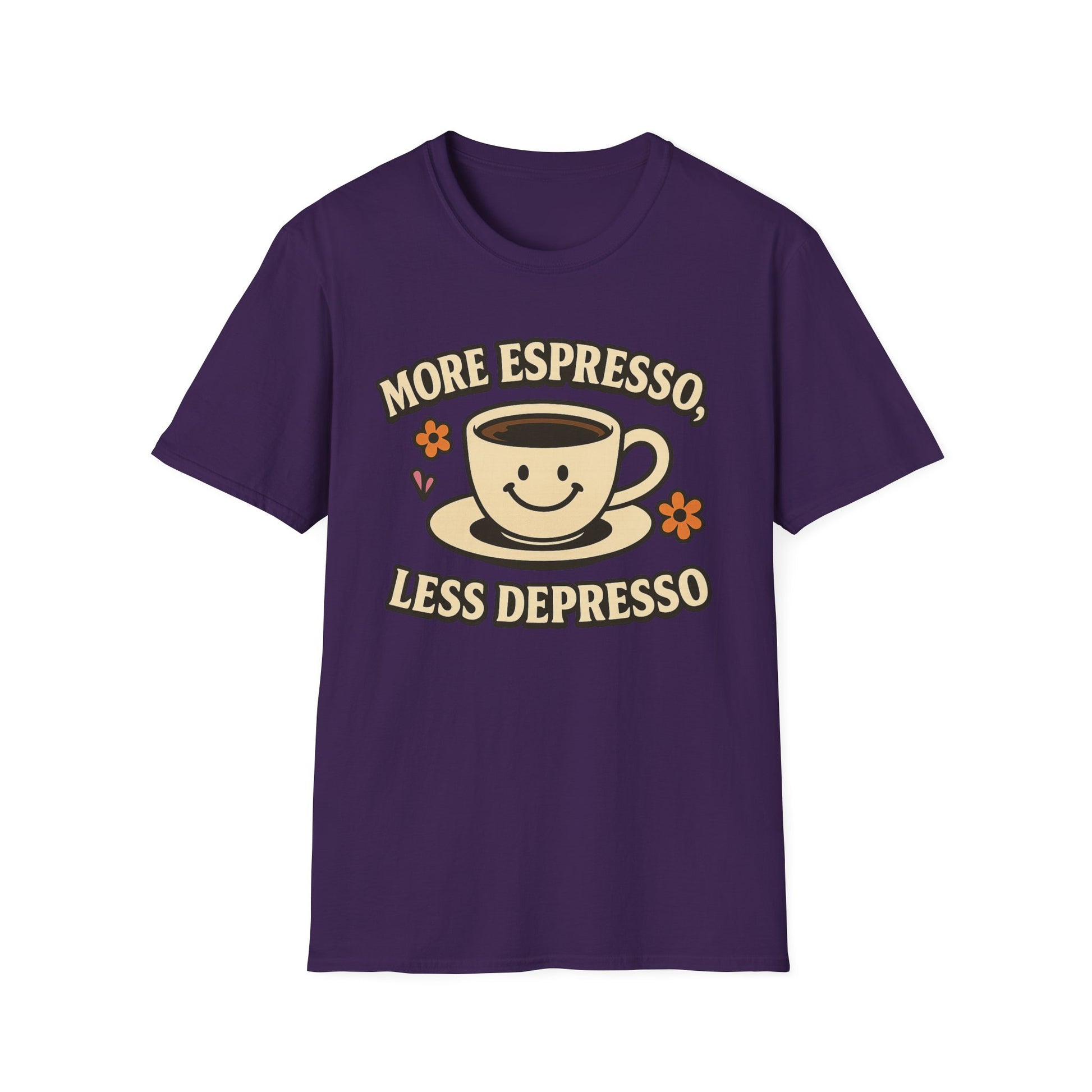 Elevate your casual wardrobe with this Unisex Softstyle T-Shirt, designed for ultimate comfort and style. With its cheerful "More Espresso, Less Depresso" print, this tee radiates positivity and energy, perfect for coffee lovers! Whether you're lounging at home, meeting friends for brunch, or heading out to a casual gathering, this shirt fits seamlessly into your lifestyle. It's an ideal gift for holidays like Christmas, birthdays, or just to brighten someone’s day. Perfect for anyone who appreciates a little humor and good vibes, this t-shirt is a fun addition to any fashion lineup.